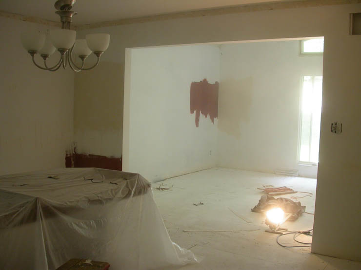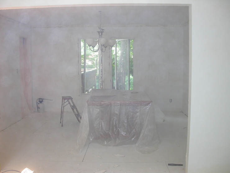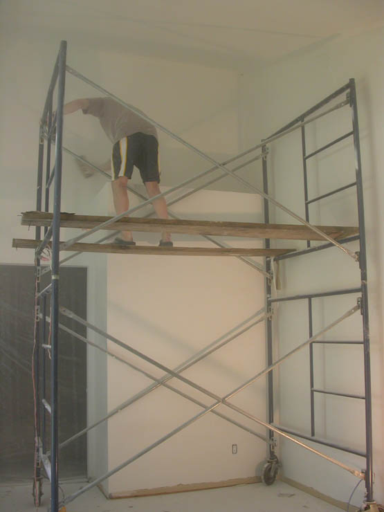 I’ve been plugging away at the house. I think I’m just about done with plaster in the living room and dining room. All that wall damage…I’ve put nearly 10 gallons of drywall joint compound in. I have just a bit more sanding left, and then I’ll finish the foyer, and then paint! should be soon. I’m excited. You can see the reds on the wall in the living room. We’re going to do stripes. Wendy took a few of me working up on the scaffolding (wow, thanks Troy, that makes life so much easier). Wendy also took a picture while I was sanding – good thing I wear a respirator, don’t you think? Just a bit of dust in the air. (from wb: I took the third picture because I thought the table looked like I imagined Miss Havisham’s. Any Dickens fans out there?)