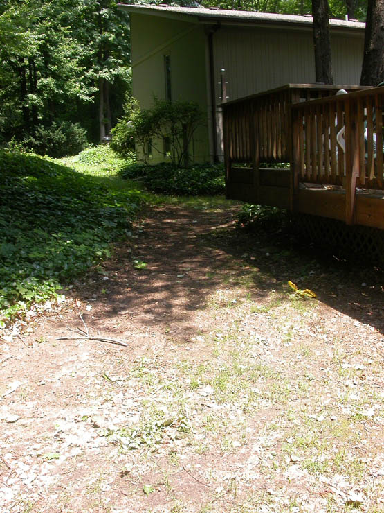 This next photo is the front flowerbed, minus all the ivy. It took about two and half days to get all the ivy out of there. Imagine, if you will, the previous picture with a flowerbed beneath. I think I found a rosebush. All those stepping stones are “new,” meaning that I didn’t know they were there. Oh and that’s plaster dust coming out the front window.