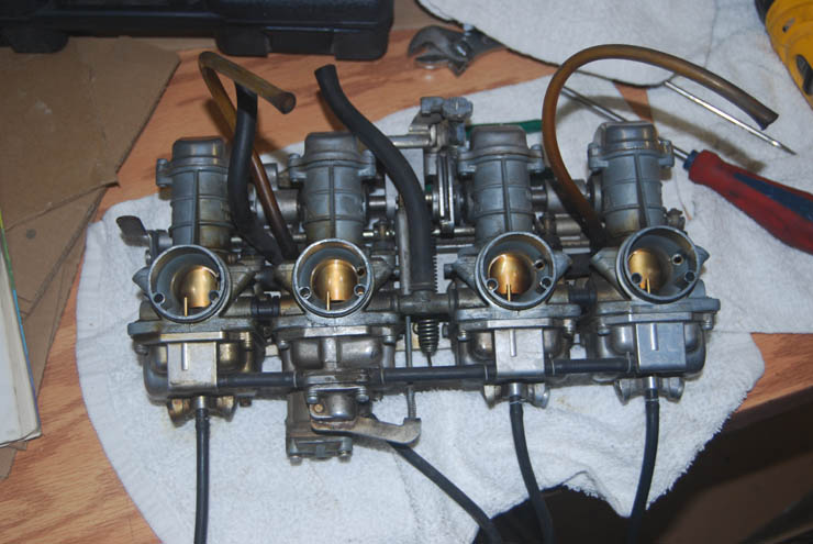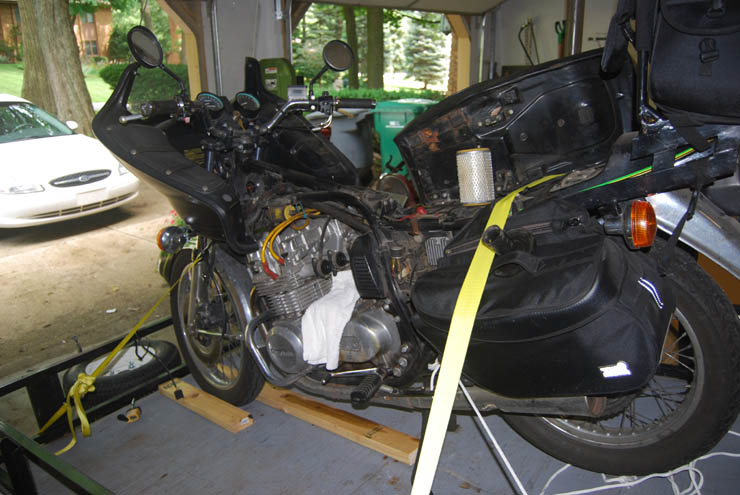 Again Wendy, my saviour, came with the car and trailer and the two of us managed to get the 450 pound bike onto the trailer and strapped down. So the bike is on the trailer in the garage and I’m not sure what is wrong with it. To me it sounds like fuel starvation, but the fuel lines are clear and they are clearly providing fuel as I can get the bike to flood. I pulled out the carburetor (the third picture) and it was totally clear (I rebuilt it last year). So I don’t know. Another possibility is an electrical problem. That’s most likely, but it is the hardest to diagnose. Sigh.