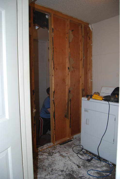 Before this bike trouble I did get a chance to start on the laundry room. I yanked down part of the wall between the storage shed in the back of the house and the laundry. Our plan is to increase our laundry room by about 5o square feet and put in a mud room – something our house currently lacks. It is tricky to work on the laundry room right now – we need it often with a baby, especially as we are using cloth diapers.
