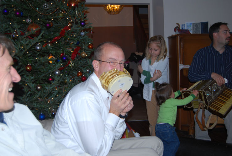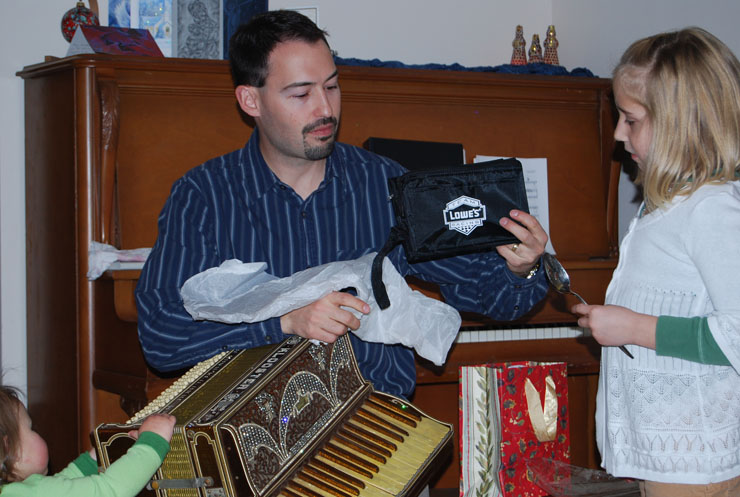 . We think it’s a planter???? Here is another photo of Joel opening his lovely lovely gift of a “man bag” from Lowe’s along with Anna and her new gift: the accordion (yes, it’s real).
