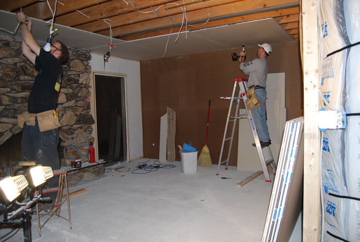 Our friend and invaluable helper, Joel, came over (is here at the moment actually) and is helping us put up the ceiling in the family room. Then it will be walls in the family room, ceiling and walls in the laundry room, then toilet and sink and we’re practically done!! Here is a photo of the drywall lift that tried to kill David: