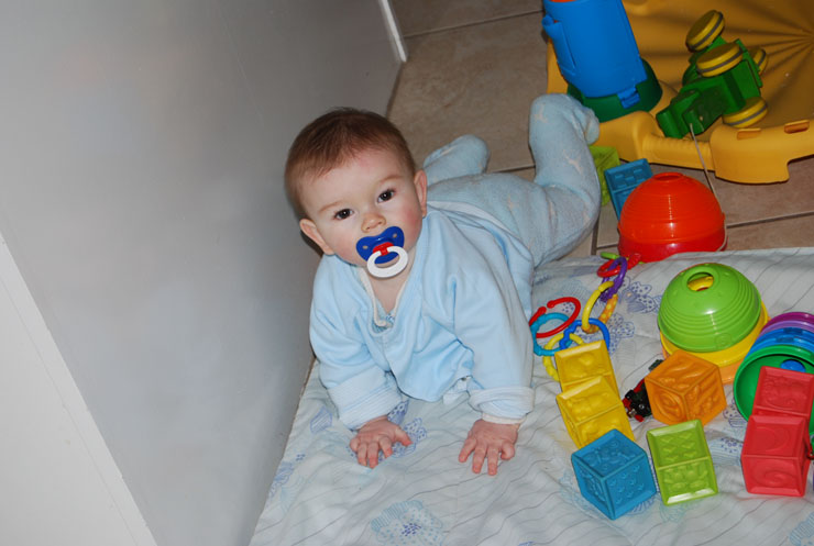 Jan has been busy trying to avoid learning how to crawl forward. Backward seems to be okay and rocking violently on hands and knees seems to be good too, but crawling forward is apparently uninteresting. Thus: .He has also been learning new words, such as “cloisons sèches” which means “drywall,” and this is why he is learning that: