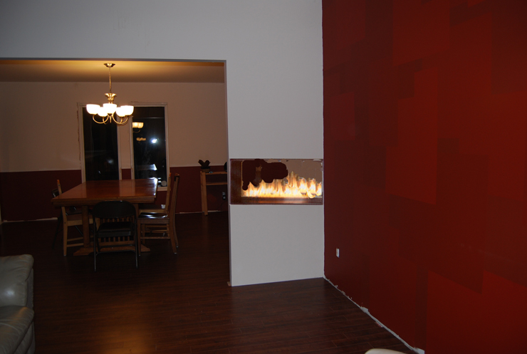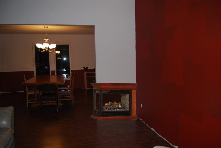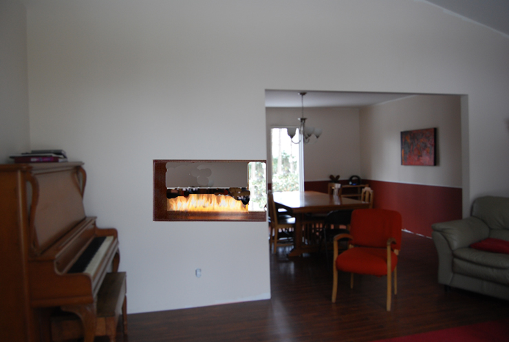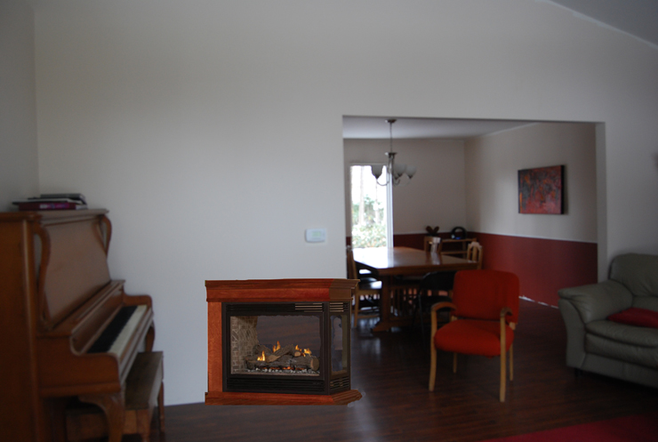 This one is the same basic idea as before but on the other side of the dining room opening. It would be visible from the front door, which folks seemed to think a good idea. It would be central to both rooms and therefore toastier.