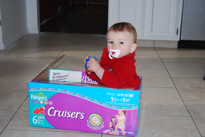Many thanks to the folks sending birthday gifts – Wendy’s parents sent some toys and a book, and Jan loves his cell phone, which makes nice noises when he pushes buttons (which is his favourite thing). Also, today when Jan and I got home there was an interesting box on the front step, full of good things. While I’m sure Jan was thrilled with the clothes, he seemed to enjoy the cars a little and the box the most.
