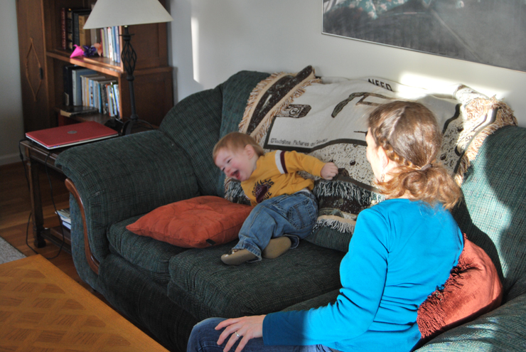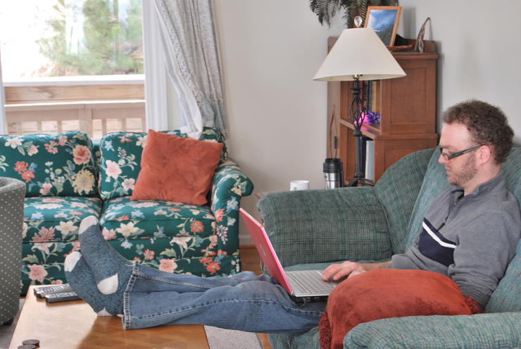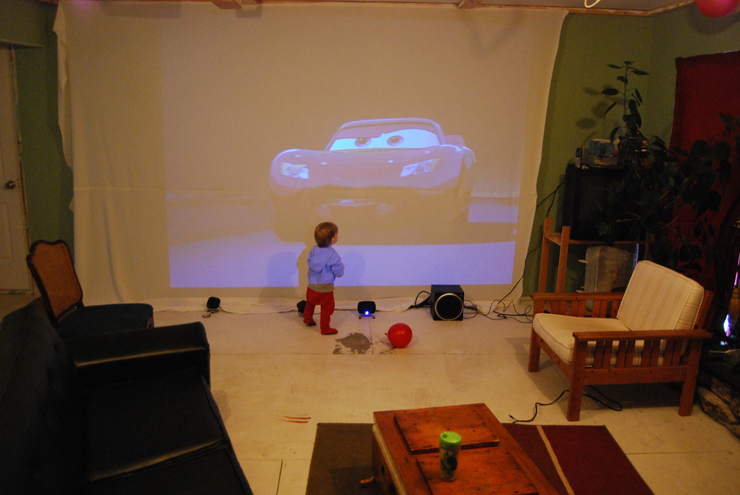 This photo is not from the cottage at all. This is this weekend when we set up the giant screen (cloth stapled to the wall) so that we could project the opening of the Olympics! Yay! This is prior to broadcast and Jan is astounded by the size of Cars, his favourite movie. That Lightning McQueen, he’s HUGE!!