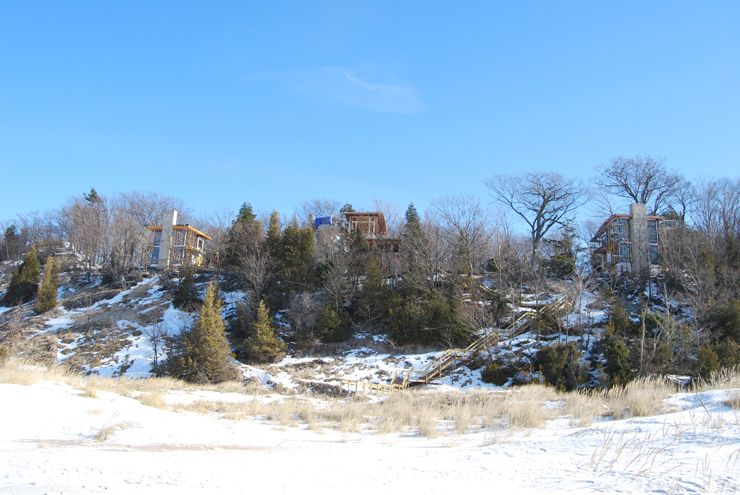 The craziest thing about these pods is that they have copper roofs! Man, the expense! They are separate because the Department of Natural Resources was concerned about the size of the footprint and the impact it would have on the dune (erosion etc), so they are separate but connected by decking. They have an immensely long driveway that leads to another copper covered garage in the woods and then another longlong walkway up to the pods. We know all this from scouting around in the woods and also from trespassing and running into the architecte who had to tell David and Kathryn Everything.