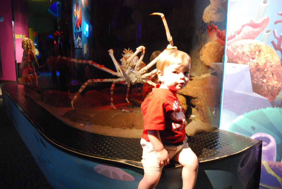 I think He was a little scared of the giant crab, but he kept trying to touch it: