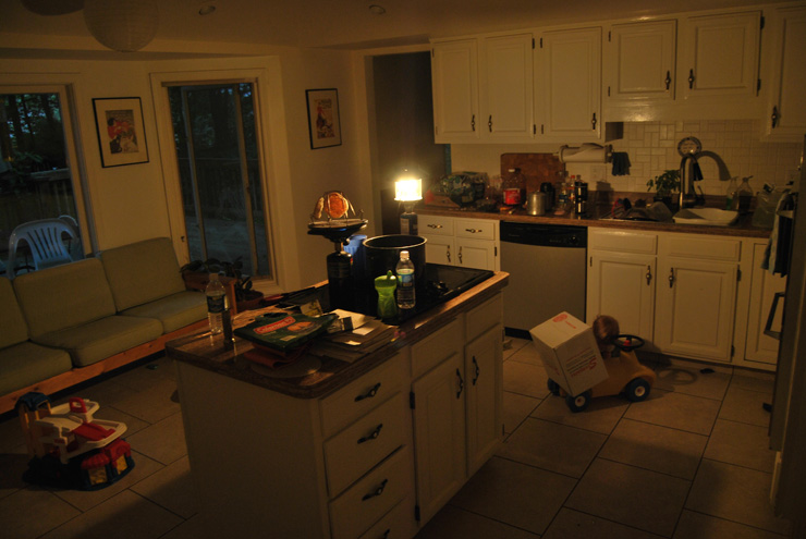 So this rain deluge all started when Jan and I were in Minnesota. Actually, it has been raining in Indiana for seemingly forever, but the intensity ramped up significantly on our visit. The new-Minnesotans, my parents, have never lived in tornado alley before. Us jaded Hoosiers (that’s folks from Indiana) were unimpressed. Jan slept through the whole thing while I tried to and my parents camped out in the basement watching the NBA final!!! That’s the channel that was showing tornado information. To be fair, the tornadoes did come within a town or so from where my parents now live in Rochester. So, close-ish. That’s nothing compared to a couple days ago here in South Bend where the tornadoes went through our old neighbourhood! THAT was really close. David and Jan and I were all glued to the screen that night. Jan kept saying, “what this show?” The screen was showing nothing, of course, that made any sense to him. David has been able to get very little done on the house what with the power outage and the amount of rain. He doesn’t want to use a tile saw inside the house, understandably. Oh yes, did I mention power-outage? We were without power, which means water, from Friday 5pm to Monday 5pm. If you are prepared for this and expecting to be camping, it’s no big deal. If you are inside your house and not expecting it, it’s a different situation. It’s one of those “do we go into full-fledged camping mode or do we just expect it to come on any minute?” We got 10 kitty-litter buckets full of water from church. Most of our church family was without power too if not for even longer. And apparently the storm was only a half hour long. Goodness! Here is a photo of the power outage time. Notice the bottles and bottles of water lined up. Also visible is the propane lantern and the propane stove with the camp toaster on it. It’s kind of a mess because our house is pretty dark even during the day in the summer what with all those trees, so you cannot see the dirt. That’s my excuse and I’m sticking to it.