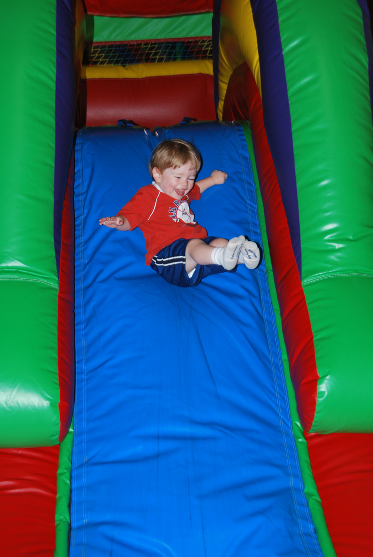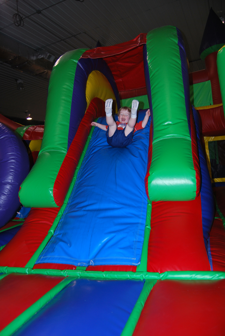 Jan and I have spent each morning doing things like grocery shopping after throwing away everything in the fridge, shopping for summer school, planning for summer school. This past Friday, however, we went to Bremen Bounce. This is a big warehouse about a half hour – 40 minutes away full of giant inflatable bouncy things. Jan’s been before with his daycare, but I hadn’t. Clearly, as these pictures show, he thinks it’s the greatest thing ever.