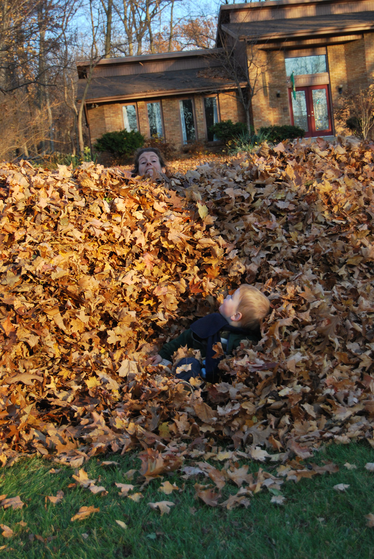 In the middle one, I am more or less standing upright; I’m leaning over somewhat, but we really do have that many leaves. And in the last photo, no we have not had a new, surprise!, addition to our family except on Mondays. That’s the day when David looks after the little boy of the folks who watch Jan the other days. Kid-swap, I guess. Jan spends a lot of time with BabySam (all one word). David actually took a whole series of photos of Jan and BabySam because Sam kept sinking lower and lower into the leaves until by the end he looks quite unimpressed. But I didn’t have time to upload them all so you’ll have to imagine. It was pretty tiring doing all these leaves and if we have a good stiff wind before they’re all picked up, I swear I’ll just… swear. I think we should cut some trees down. Never thought I’d hear myself say it, but a bit of grass and a bit less work might not be a bad idea.